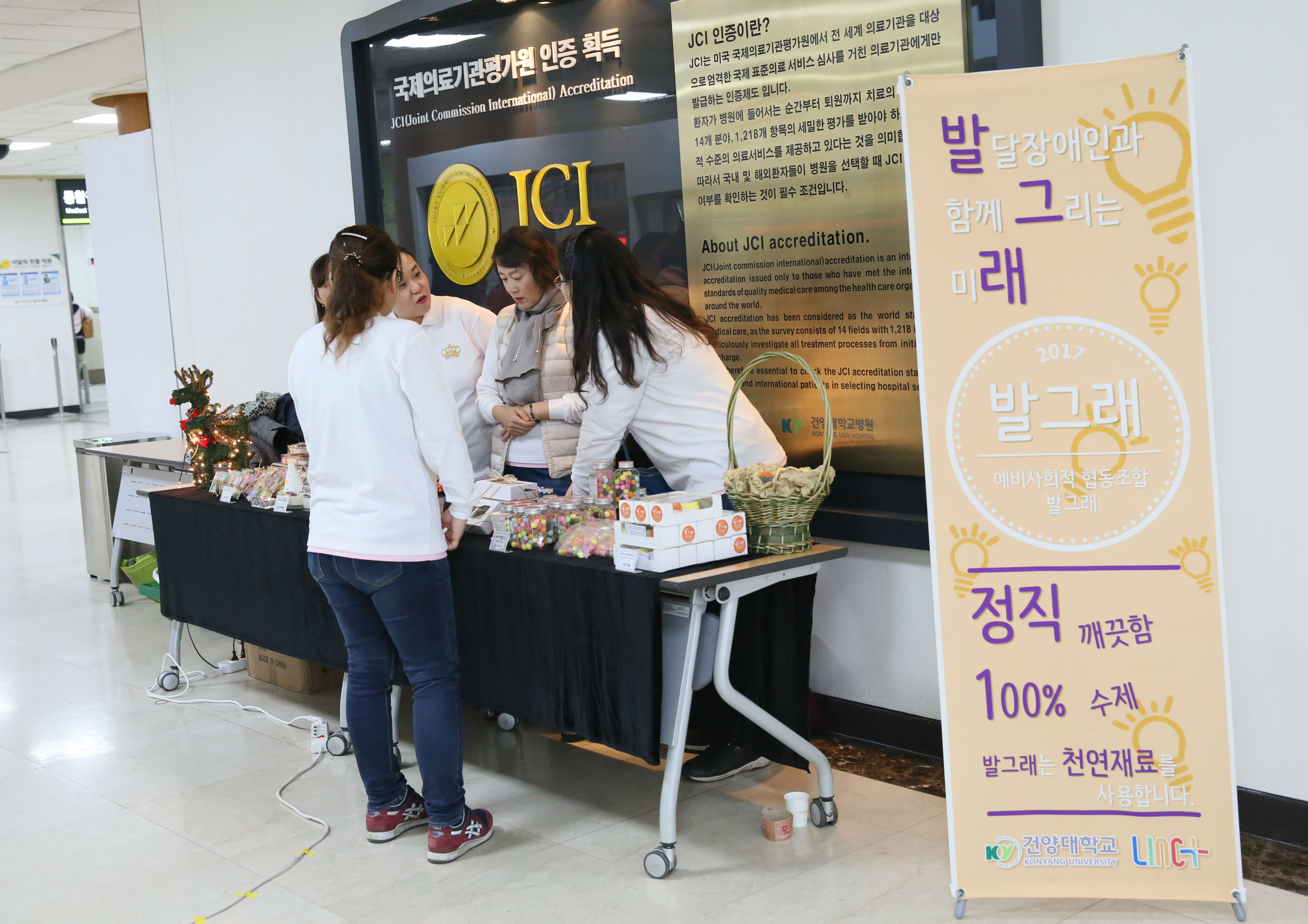 건양대학교(총장 정연주) 링크플러스 사업단이 ‘발달장애인과 함께 그리는 미래’라는 뜻의 발달장애인 자녀를 가진 부모님들과 함께 설립한 예비 사회적기업인 ‘발그래’가 10일 건양대병원 1층 로비에서 수제비누 및 수제청 판매행사를 가졌다.