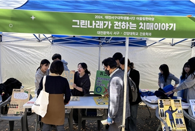 건양대 간호대학 그린나래, 치매인식개선 캠페인 건양대학교(총장 김용하) 간호대학(학장 임효남) 학술동아리 ‘그린나래(지도교수 김두리)’ 학생들이 6일 대전 서구청에서 주관해 보라매공원에서 열린 어울림한마당 행사에 참여해 치매인식개선 캠페인을 진행했다. 이날 학생들은 치매관련 OX 퀴즈, 기억력 테스트 등을 통해 치매에 대한 정보 및 자신의 기억력을 확인해 볼 수 있도록 하는 한편 노인체험복 착용을 통해 노인의 신체적인 변화에 대한 이해를 증진시킬 수 있는 기회를 제공했다. 이날 참여한 서구시민들은 캠페인 참여를 통해 알츠하이머병이 치매의 한 종류이며 건망증과 치매에 대한 차이를 이해할 수 있었다. 그린나래 학생대표 김두나 학생은 “오늘 활동을 통해 서구 시민들이 치매에 대한 긍정적 인식이 증진하는데 도움이 되었길 바란다”고 밝혔고 김두리 지도교수는 “앞으로도 학생들과 치매에 대한 정보를 서구시민들에게 널리 알릴 수 있도록 활동하며, 서구시민의 치매 예방에 힘쓰겠다”고 밝혔다.
