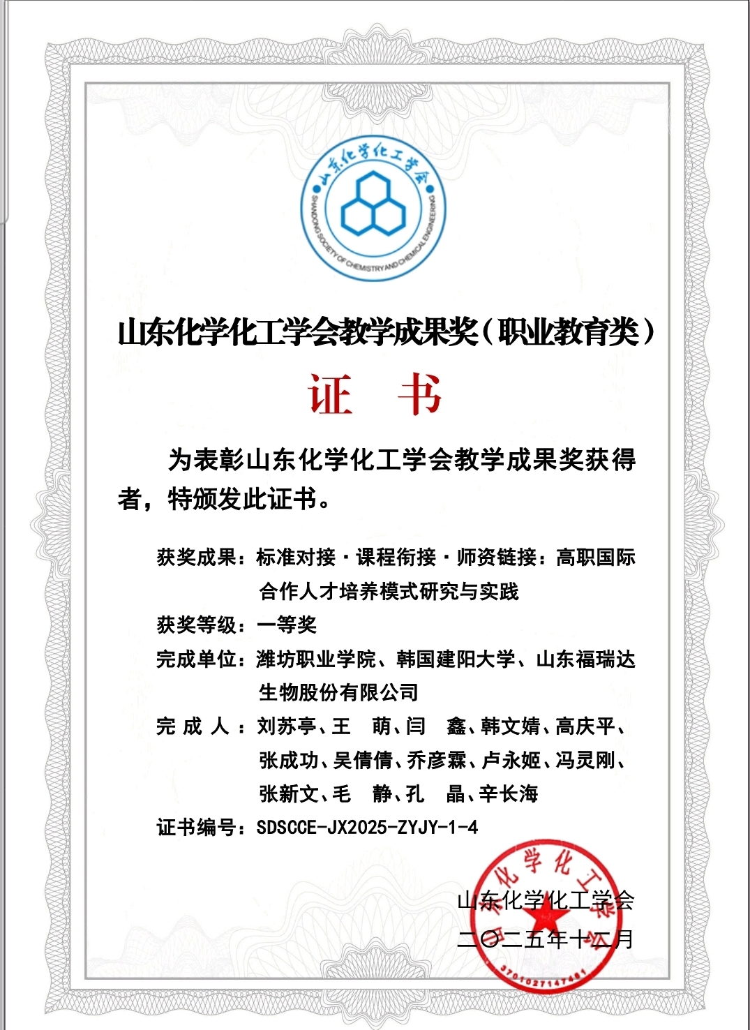 산동화학화공학회는 산동성 과학기술계 및 교육계가 공인하는 성급 권위 학술단체였다. 화학, 화공, 바이오 및 직업교육 분야에서 높은 공신력을 갖춘 학회였다. 이번 수상은 해당 학회의 엄격한 심사를 통해 선정된 교육성과였으며, 국제협력 기반 교육 모델의 우수성을 대외적으로 공인받았다는 점에서 의미가 컸다.