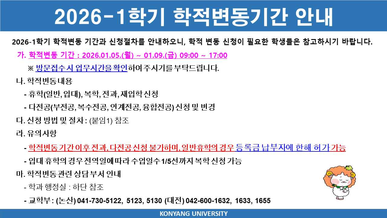 | 제목 | 2026학년도 1학기 학적변동기간 및 신청 안내 | ||||