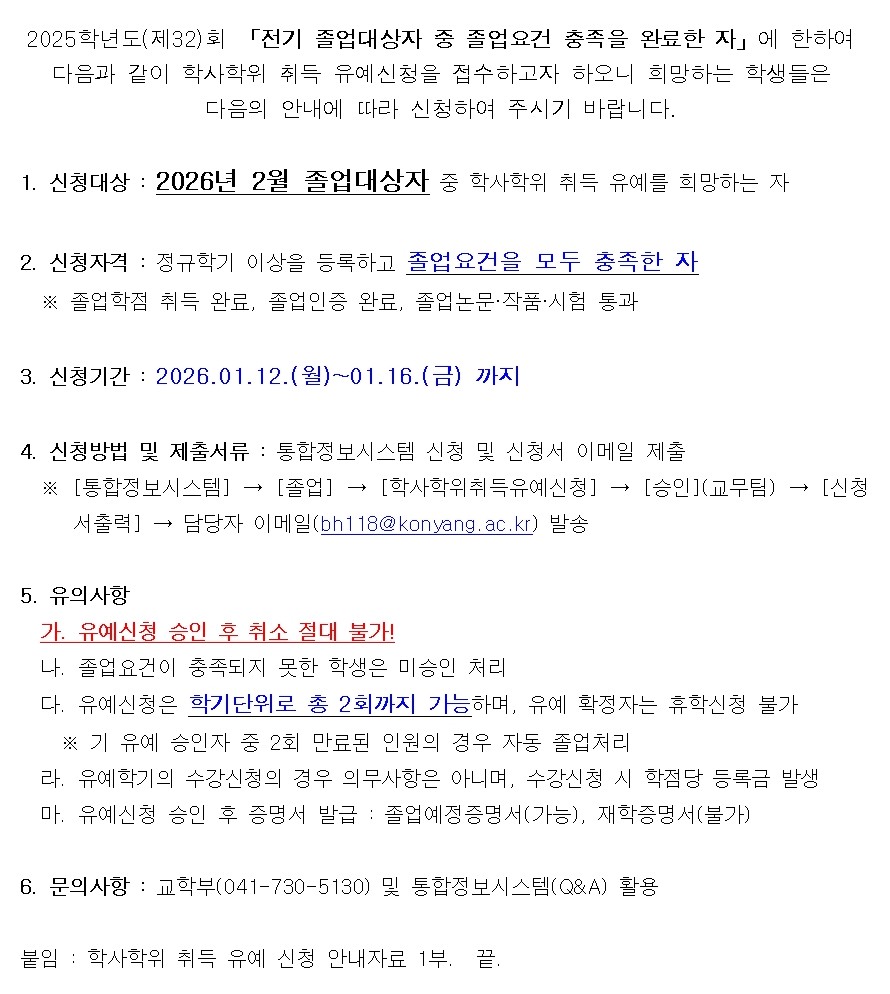 | 제목 | 2025학년도(제32회) 전기 학사학위취득유예 신청 안내 | ||||