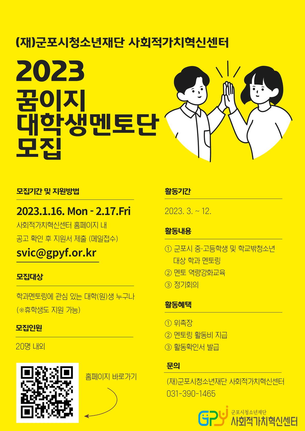 | 제목 | 군포시청소년재단 사회적가치혁신센터 2023년 꿈이지 대학생 멘토단 모집 공고 | ||||
