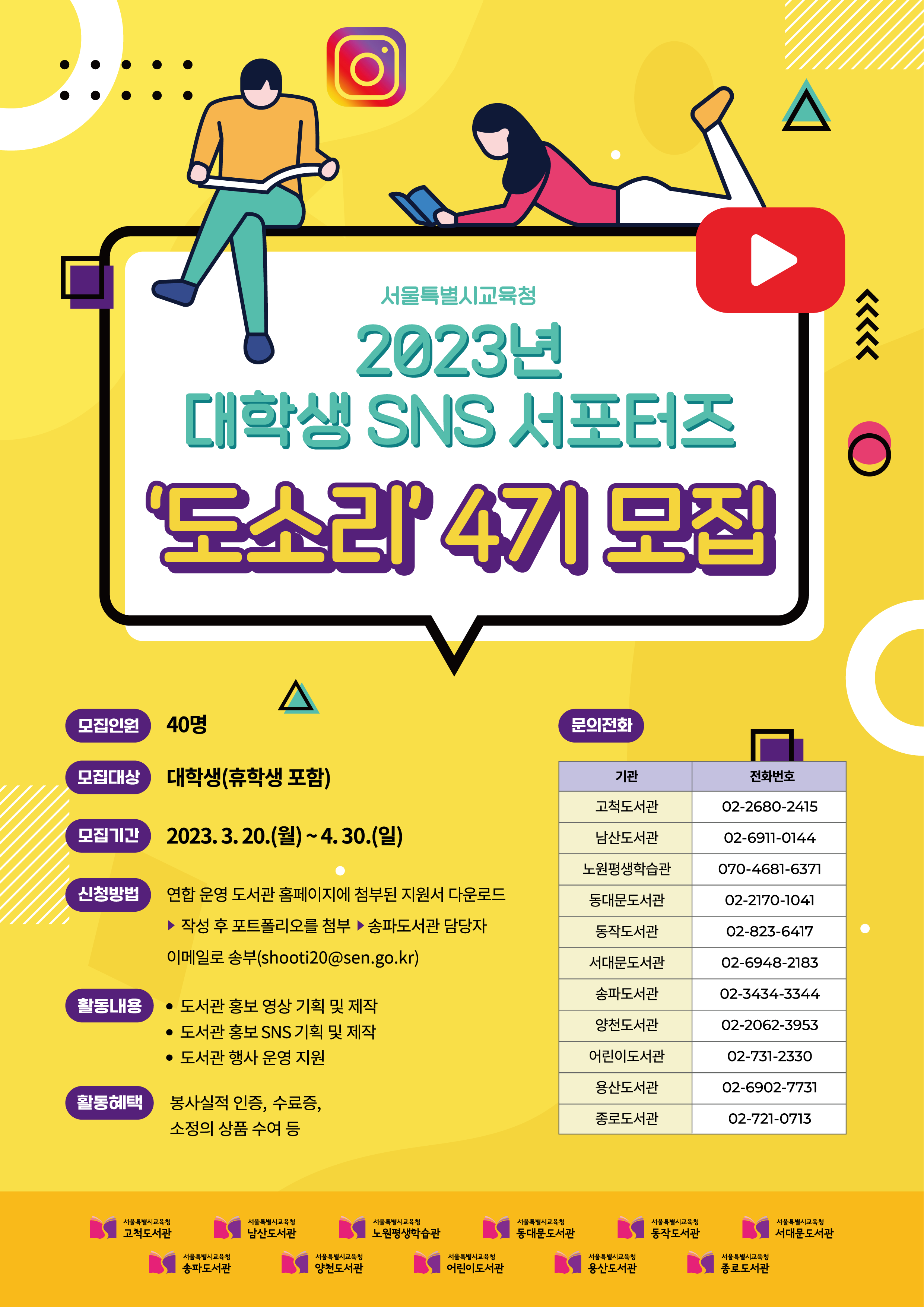 | 제목 | 2023년 연합 도서관 서포터즈 도소리 4기 추가모집 안내 | ||||