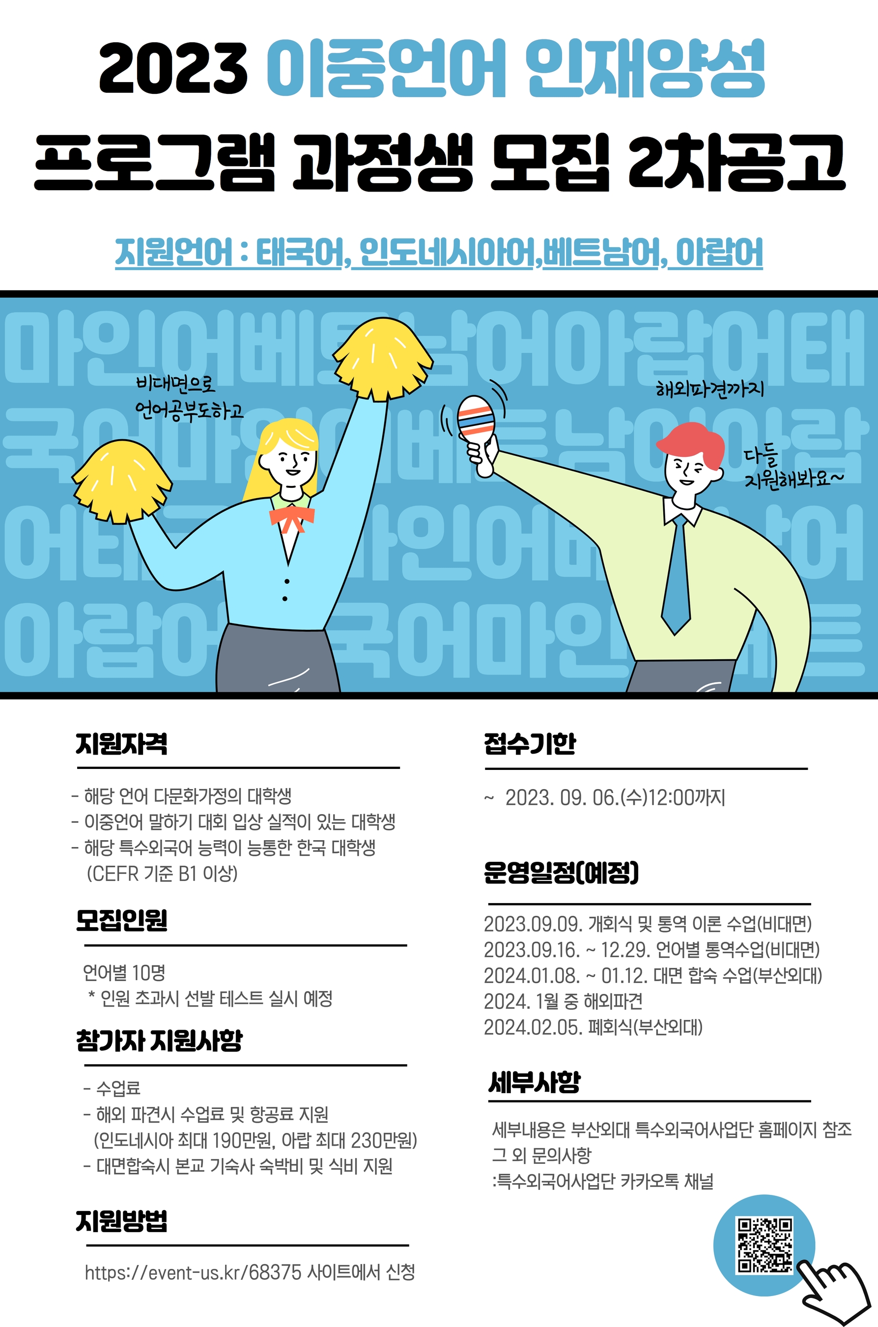 | 제목 | 2023년 특수외국어 이중언어 인재 양성 과정 교육생 2차 추가 모집 안내 | ||||
