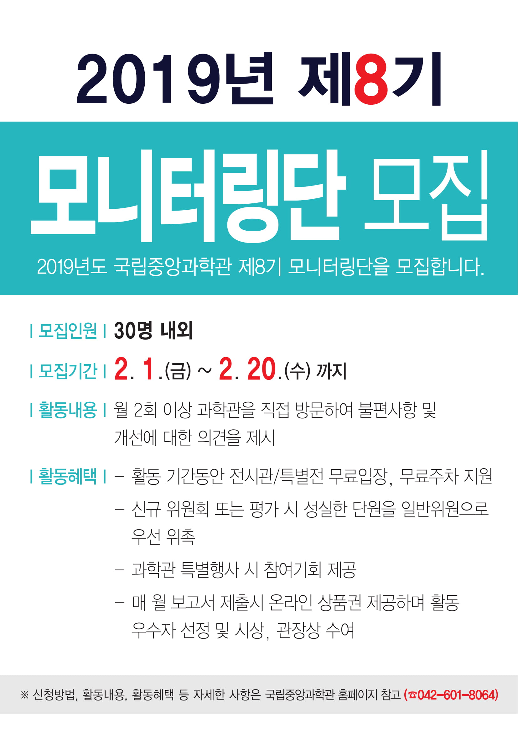 | 제목 | 2019년 국립중앙과학관 모니터링단 모집 안내 | ||||
