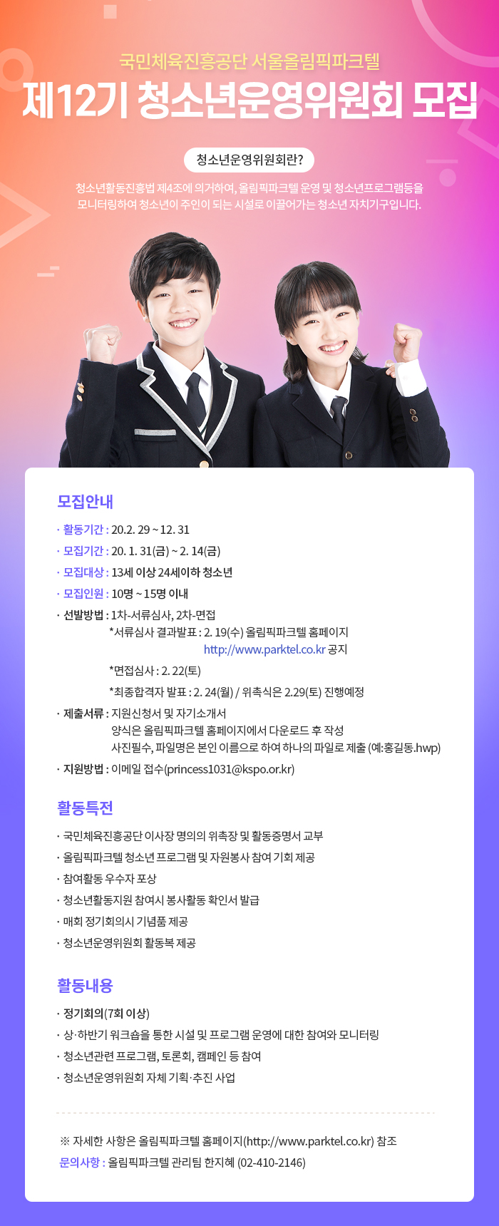 | 제목 | 국민체육진흥공단 서울올림픽파크텔 제12기 청소년운영위원회 위원 모집 안내 | ||||