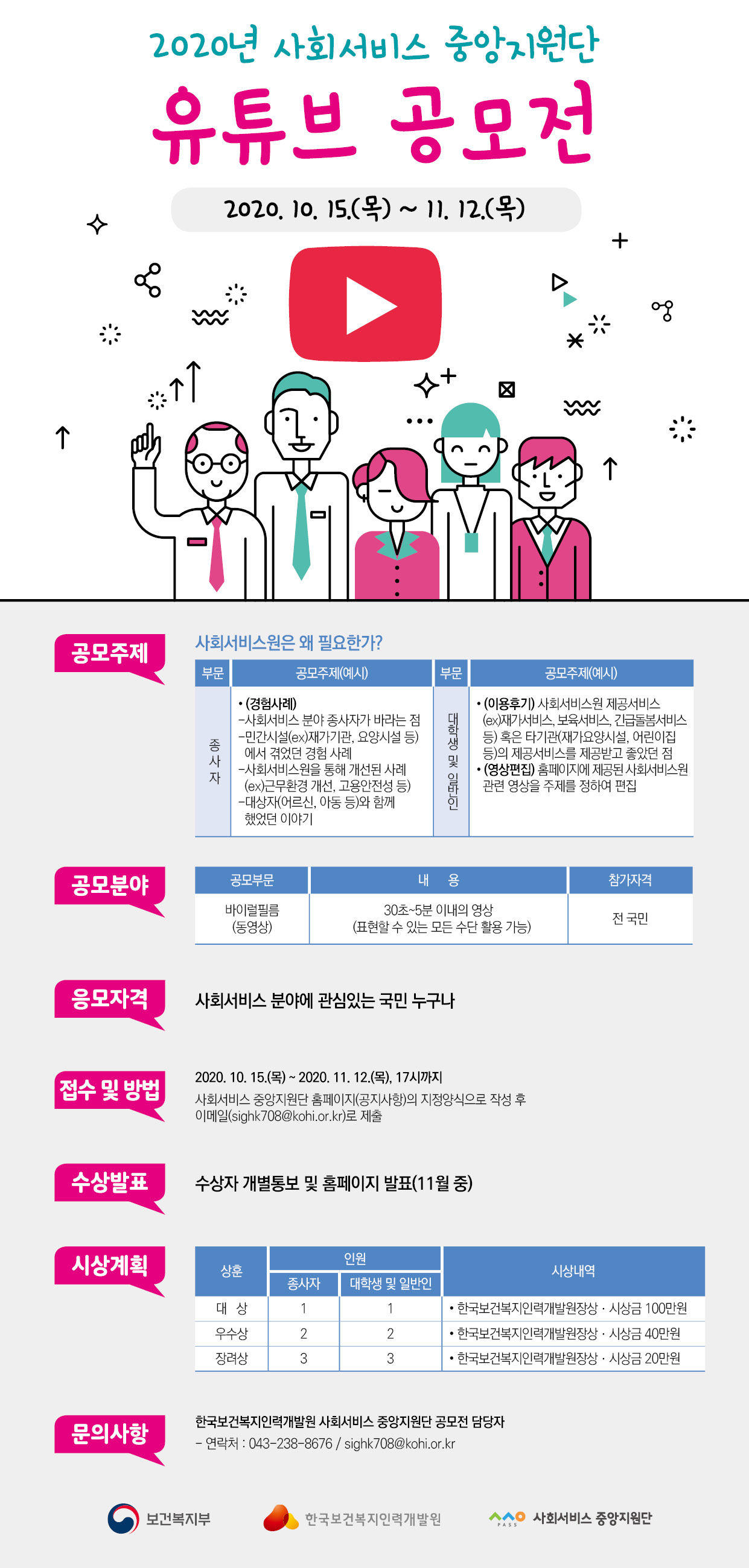 | 제목 | 2020 사회서비스 중앙지원단 유튜브 공모전(대학생부문) 안내 | ||||
