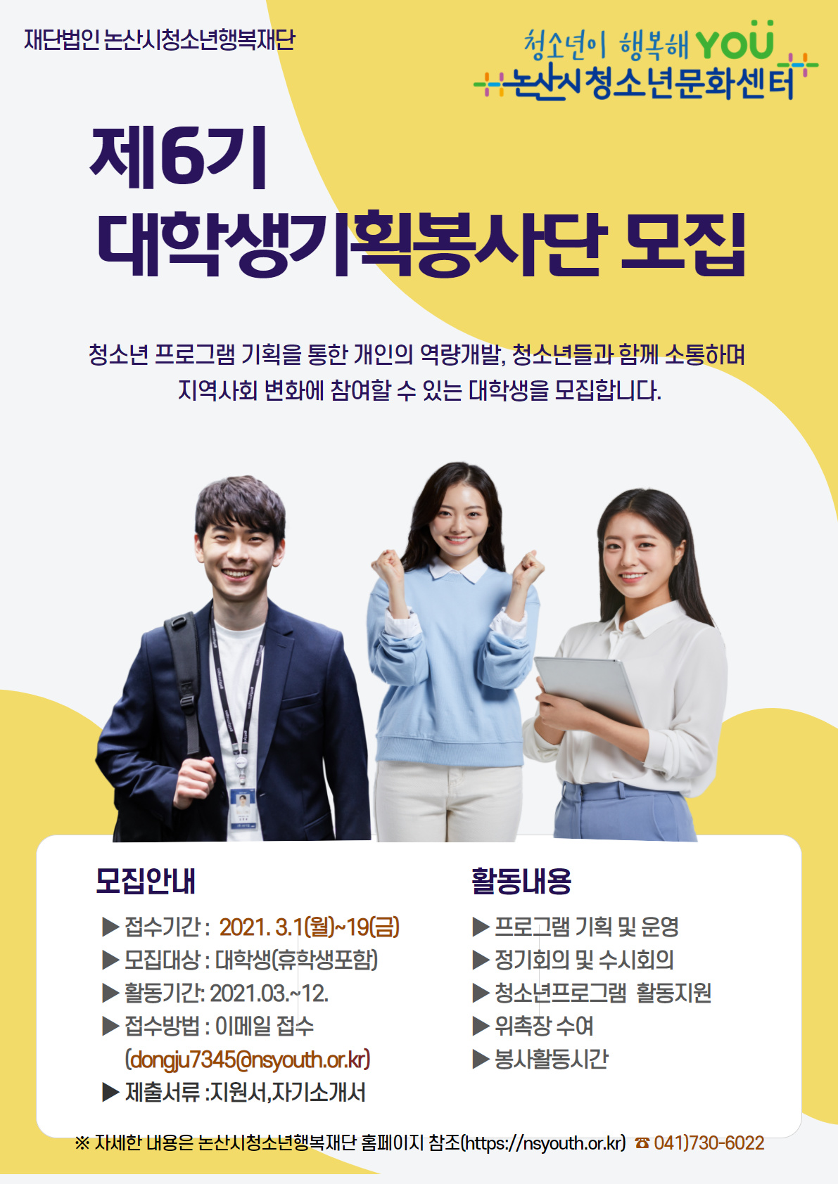 | 제목 | 2021년 논산시청소년문화센터 제6기 대학생기획봉사단 모집 안내 | ||||
