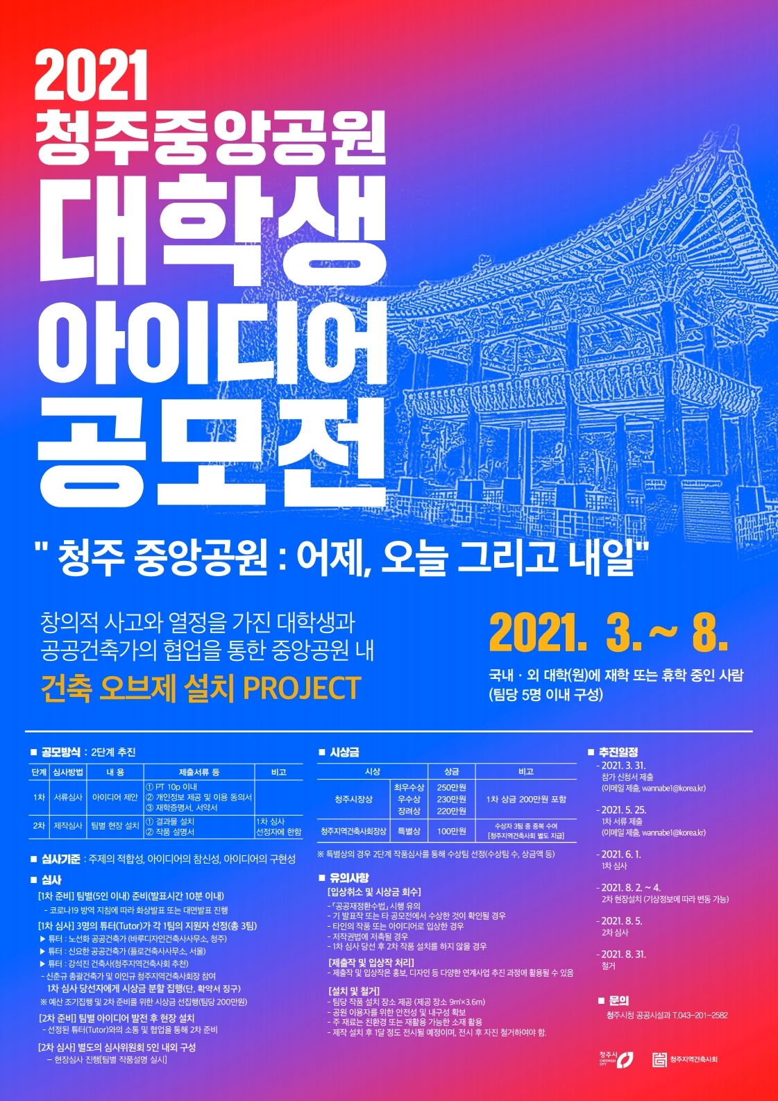 | 제목 | 2021 청주 중앙공원 대학생 아이디어 공모전 안내 | ||||