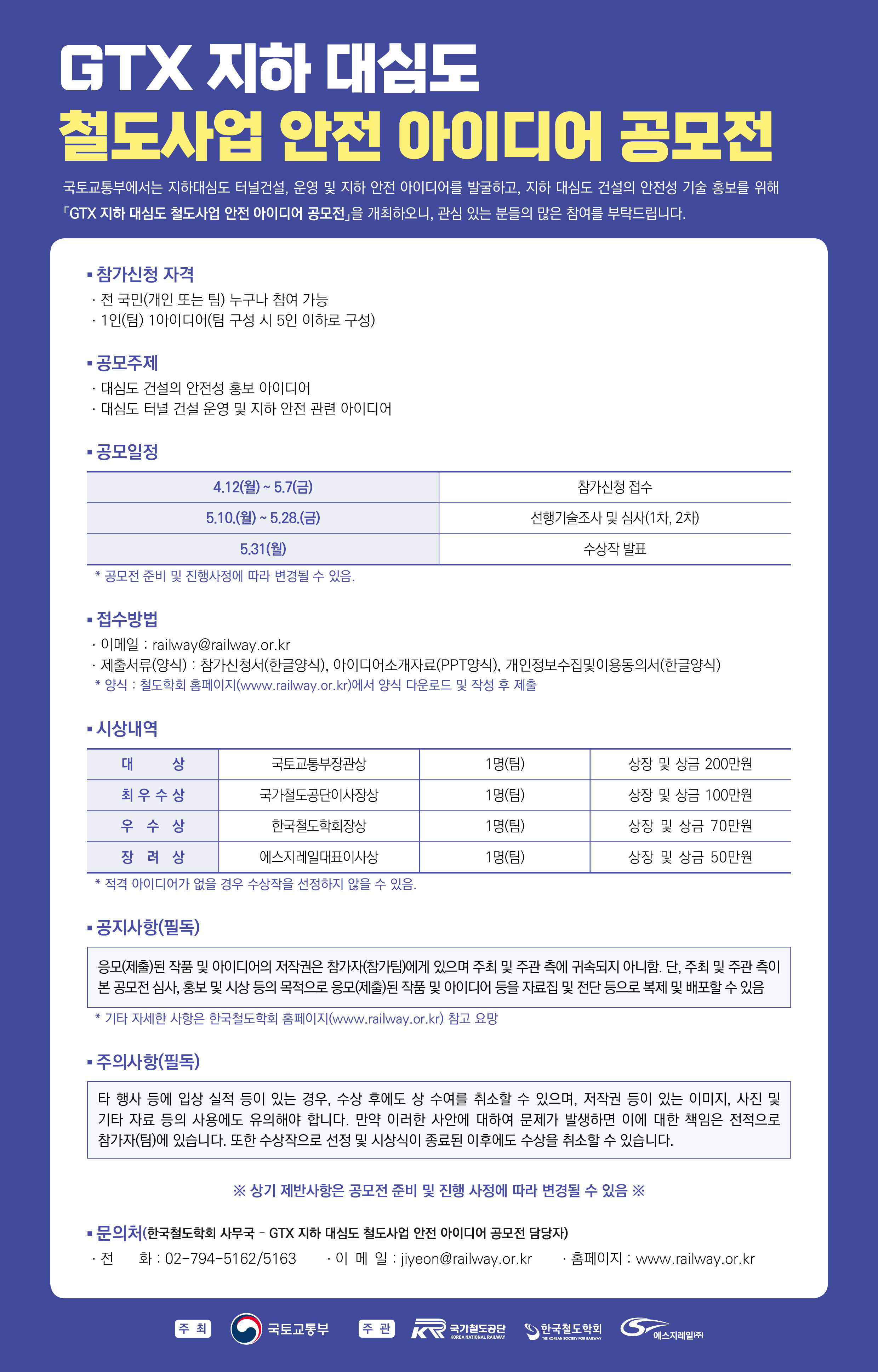 | 제목 | 한국철도학회 GTX 지하 대심도 철도사업 안전 아이디어 공모전 안내 | ||||
