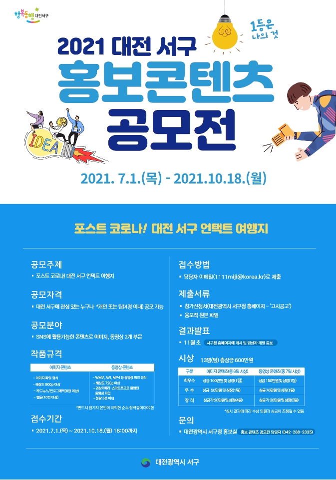 | 제목 | 2021 대전 서구 홍보 콘텐츠 공모전 안내 | ||||