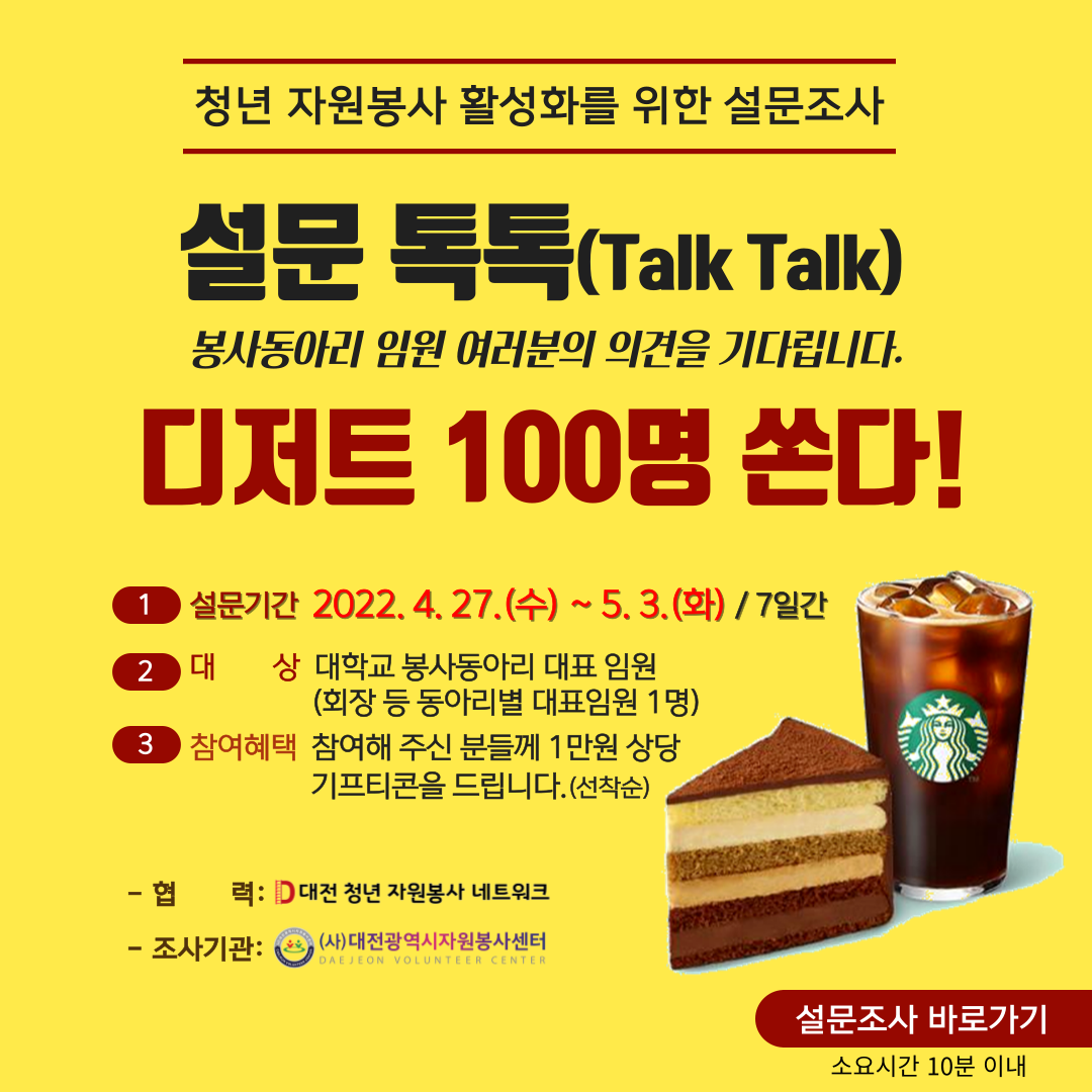 | 제목 | 청년 자원봉사 활성화 계획 수립을 위한 설문조사 협조 안내 | ||||