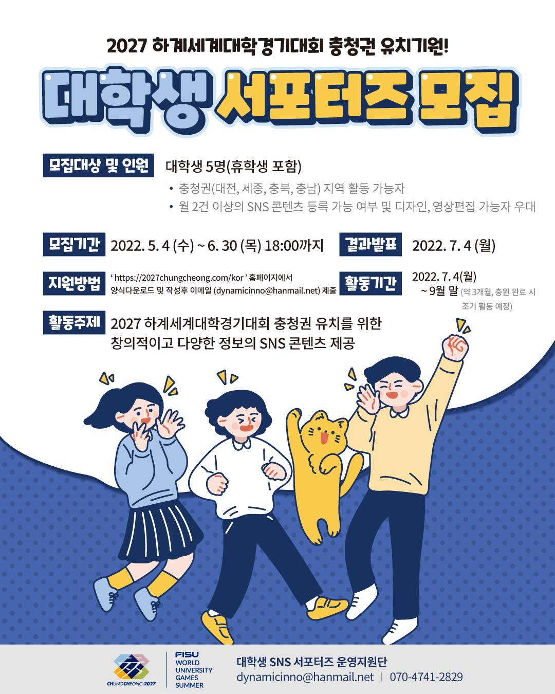 | 제목 | 2027 하계세계대학경기대회 충청권 유치기원 대학생 서포터지 모집 | ||||