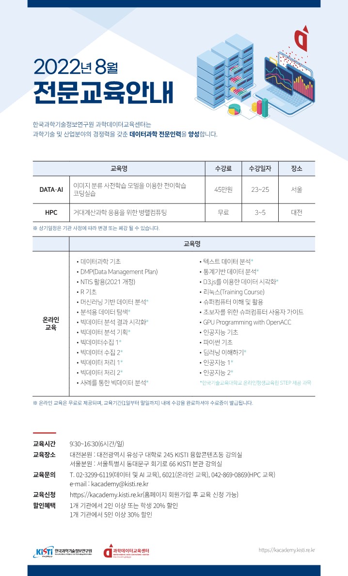 | 제목 | 한국과학기술정보연구원(KISTI) 2022년 8월 전문교육 운영 안내 | ||||