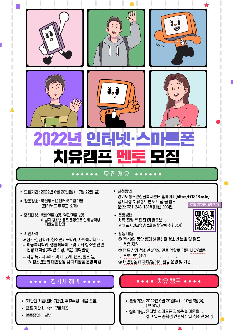 | 제목 | 2022년 인터넷·스마트폰 치유캠프 멘토 추가 모집 | ||||