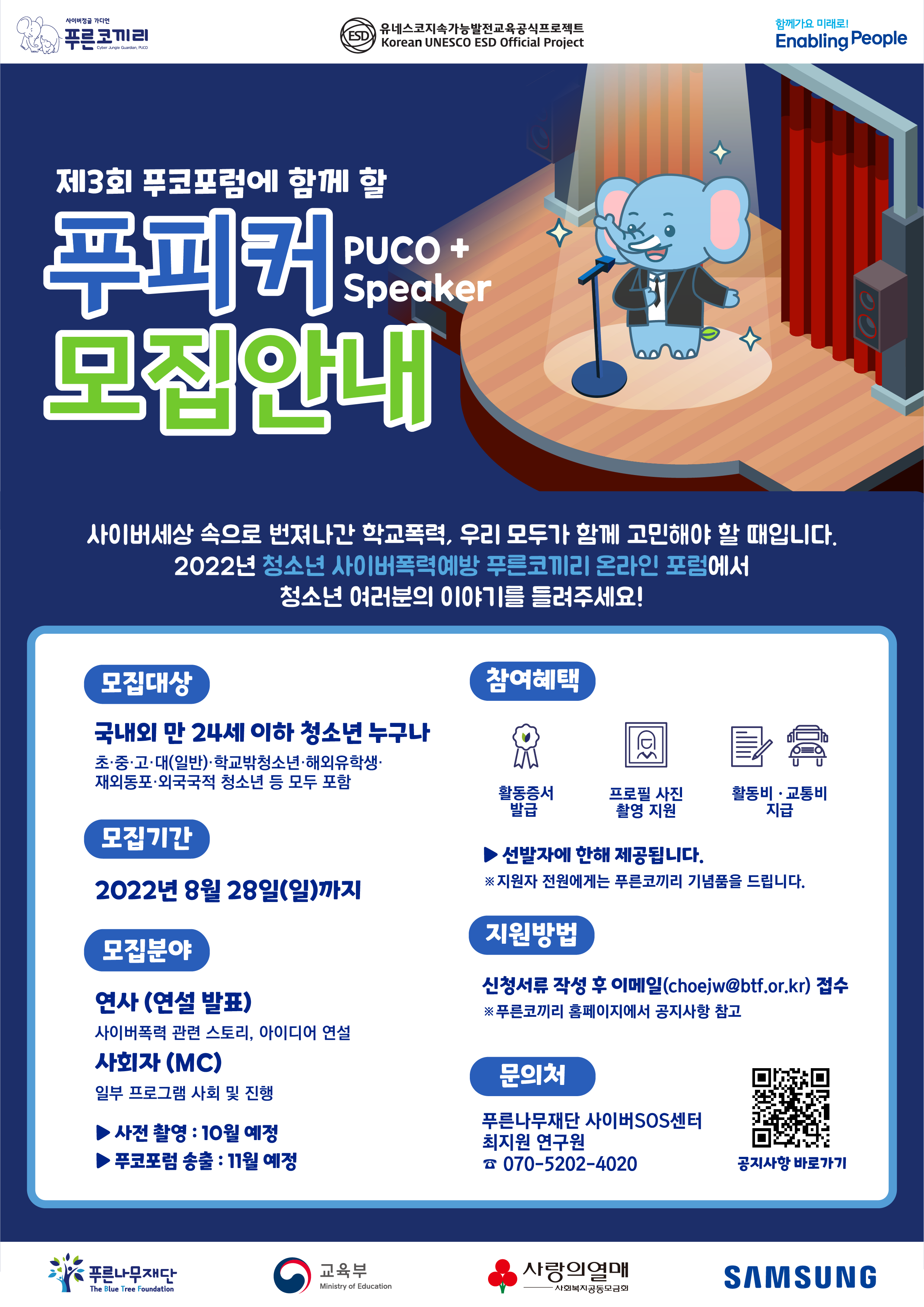 | 제목 | 청소년 사이버폭력 예방교육 사업 '푸른코끼리' 청소년 연사 및 사회자(푸피커) 모집 안내 | ||||