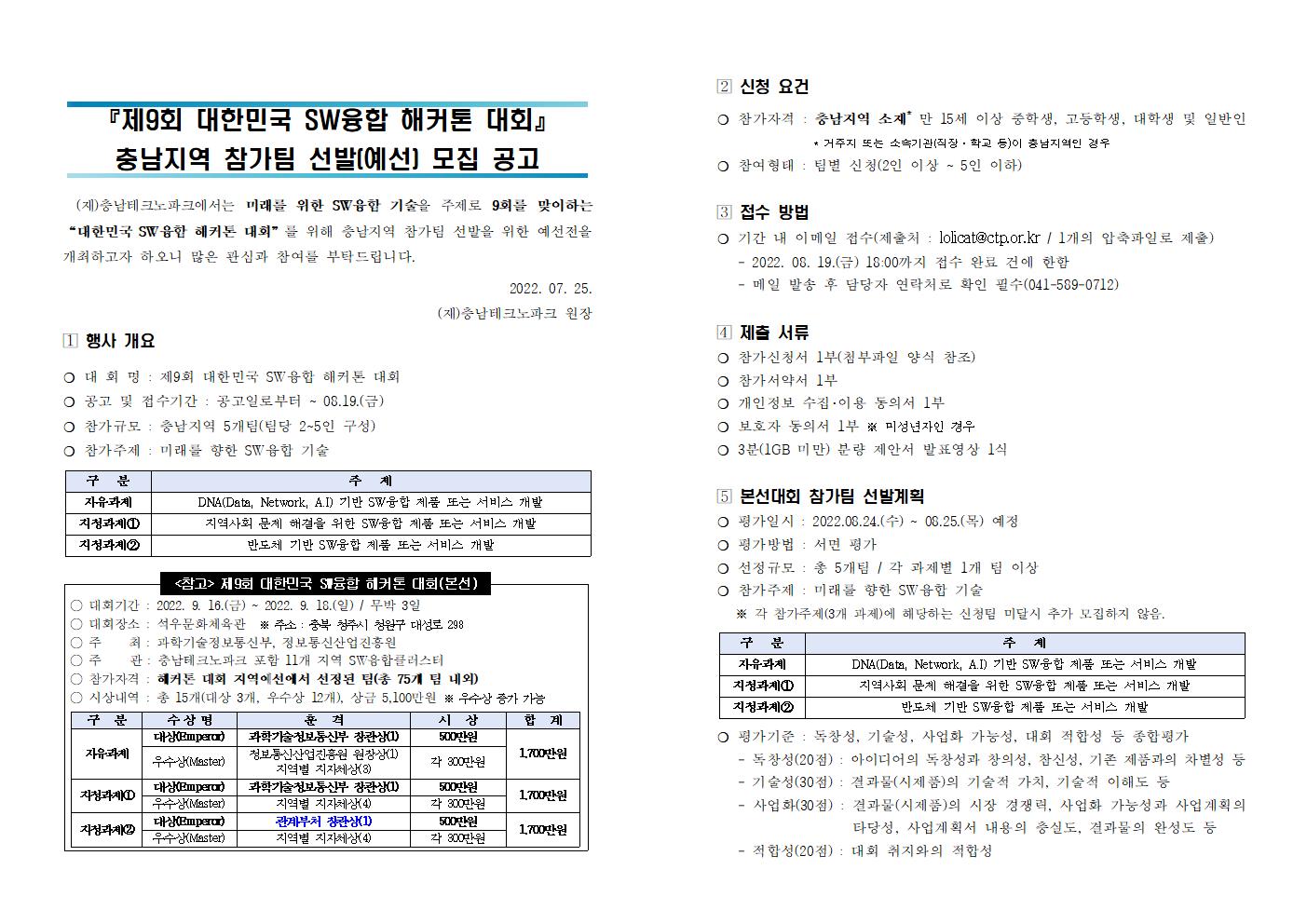 | 제목 | 제9회 대한민국 SW융합 해커톤 대회 충남예선 참가 안내 | ||||