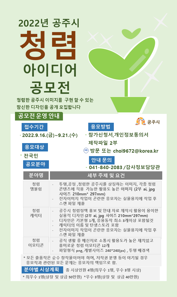 | 제목 | 2022년 공주시 청렴 아이디어 공모전 참여 안내 | ||||