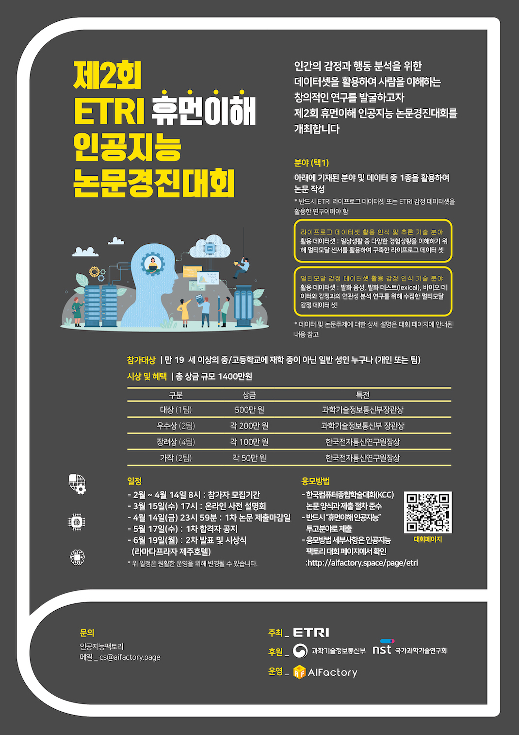 | 제목 | ETRI 휴먼이해 인공지능 논문경진대회 개최 안내 | ||||