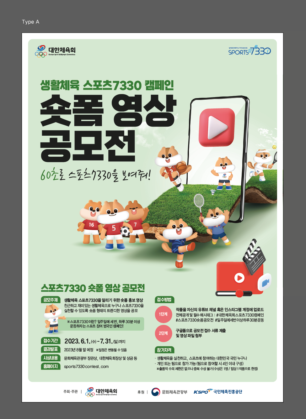 | 제목 | 2023 생활체육 스포츠7330 캠페인 숏폼 영상 공모전 안내 | ||||