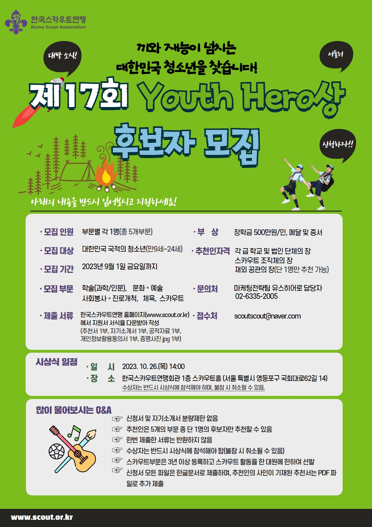 | 제목 | 제17회 Youth Hero상 후보 지원 안내 | ||||
