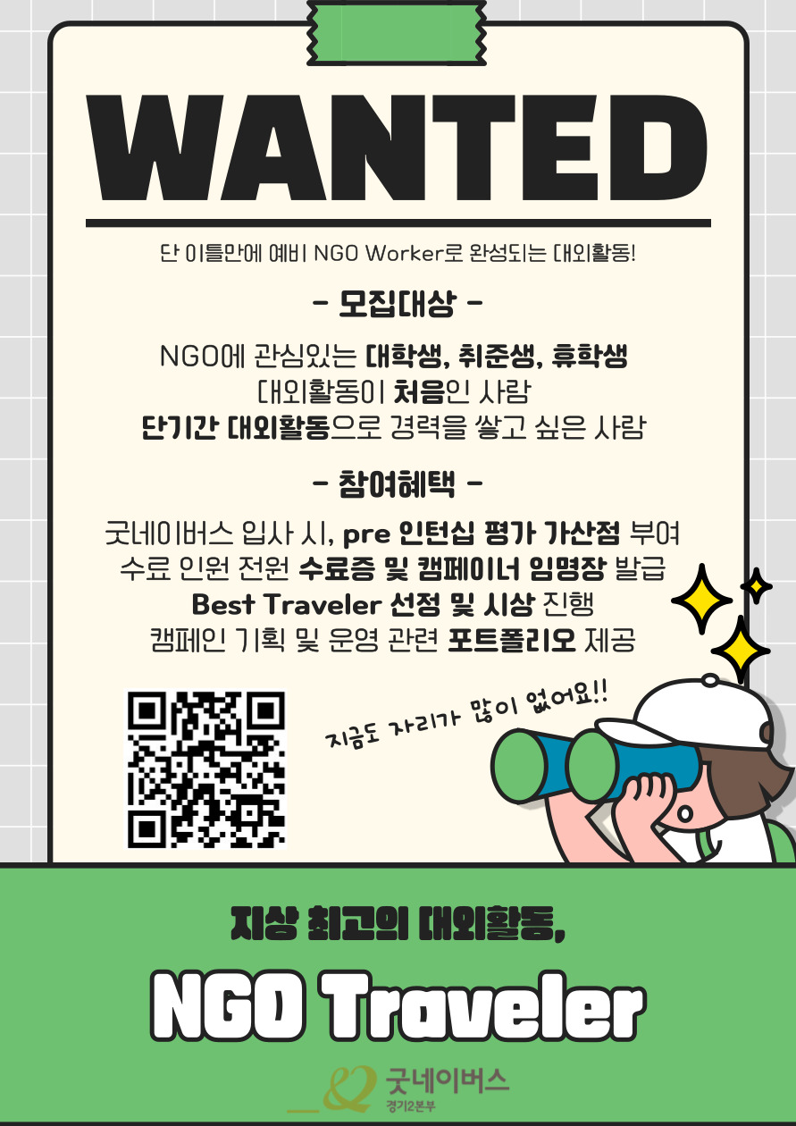 | 제목 | [선착순 마감] 굿네이버스 경기2본부 NGO Traveler 참여자 모집 안내 | ||||
