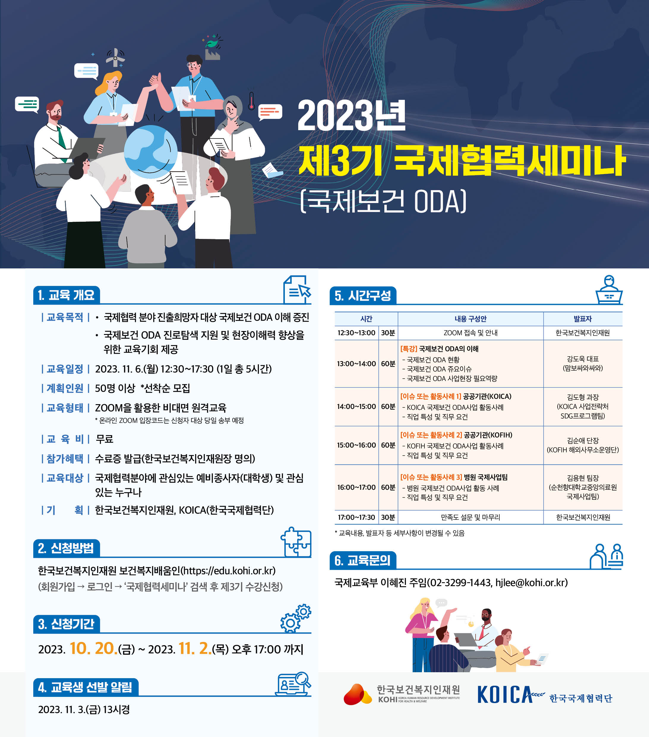 | 제목 | 2023년 제3기 국제협력세미나(국제보건 ODA) 안내 | ||||