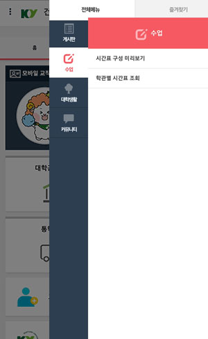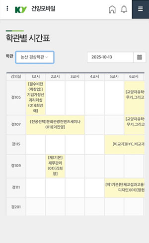 □ 경로 : 스마트키 로그인 > [건양모바일] 클릭 > 건양모바일 메뉴 > 수업 > 시간표 구성 미리보기, 학관별 시간표 조회