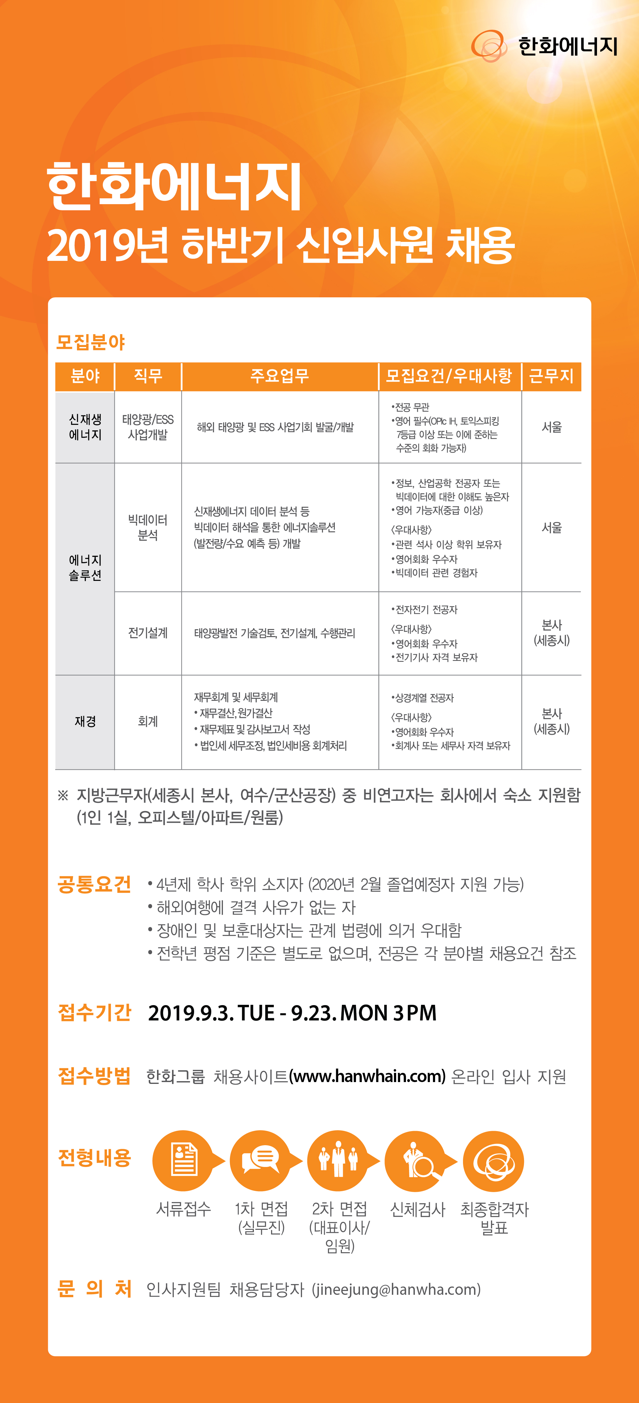 (~9/23)[한화에너지] 2019년 하반기 신입사원 채용안내 글의 상세내용